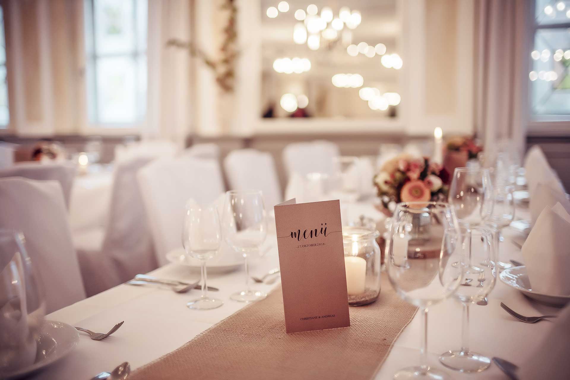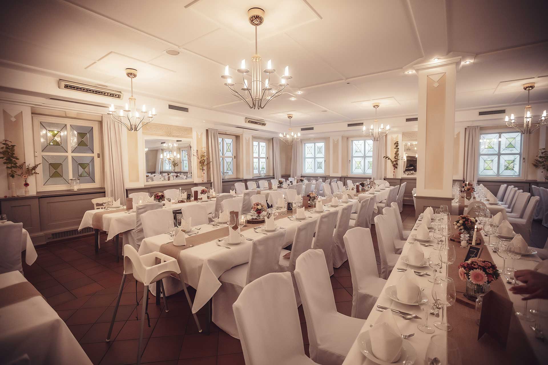 We are also happy to organize your celebrations and parties of any kind and size according to your individual wishes. In addition to the Gaststube with 60 seats, our Fichtenstube with 50 seats and the Leipold-Stübchen with 35 seats, our stylish ballroom is at your disposal.
